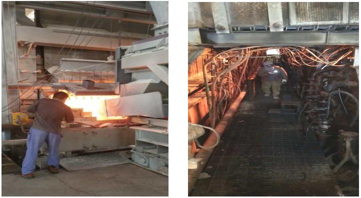 熔化工在烈焰的投料口清理衛(wèi)生;