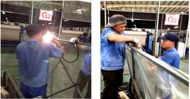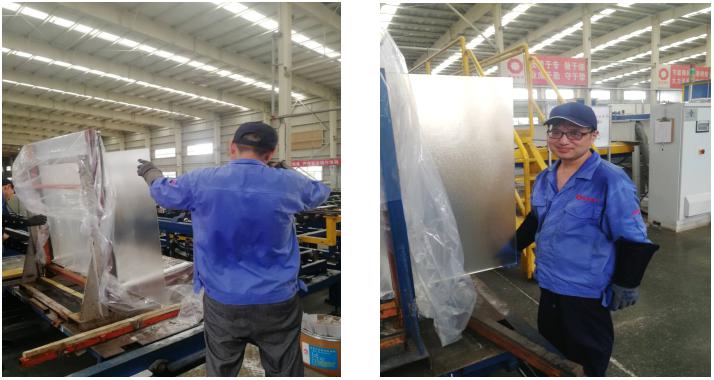 冷端下片員工,人工取板,衣服已被汗水浸透,但仍露出最美的笑容。