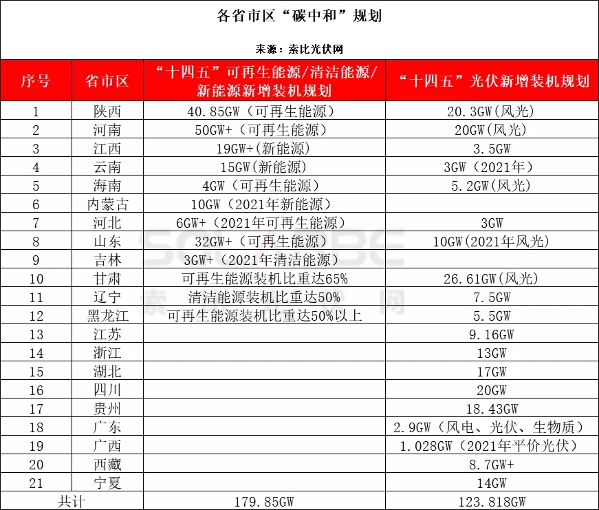 在碳中和目標(biāo)任務(wù)重、時(shí)間緊、壓力大的情形之下,全國已有21個(gè)省市區(qū)相繼發(fā)布“十四五”可再生能源、光伏新增裝機(jī)規(guī)劃,為實(shí)現(xiàn)零碳做出積極貢獻(xiàn)。據(jù)索比光伏網(wǎng)統(tǒng)計(jì),陜西、河南、江西、云南、海南、內(nèi)蒙古、河北、山東、吉林九地“十四五”可再生能源新增裝機(jī)規(guī)劃達(dá)180GW,江西、云南、河北、遼寧、黑龍江等12地“十四五”光伏新增裝機(jī)規(guī)劃達(dá)124GW。
