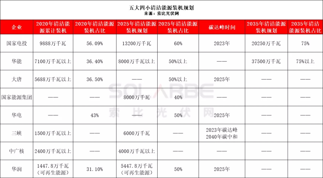除各省市區(qū)的積極規(guī)劃外,各大能源央企也紛紛做出表率,發(fā)布“十四五”清潔能源規(guī)劃,積極制定碳達(dá)峰時(shí)間表。