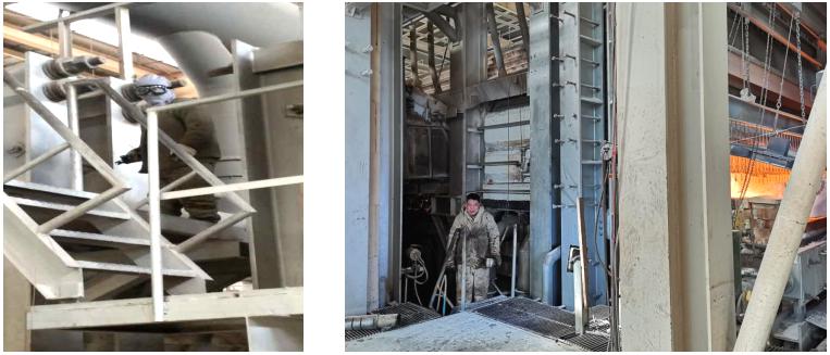 熔化工在烈焰的投料口清理衛(wèi)生;
