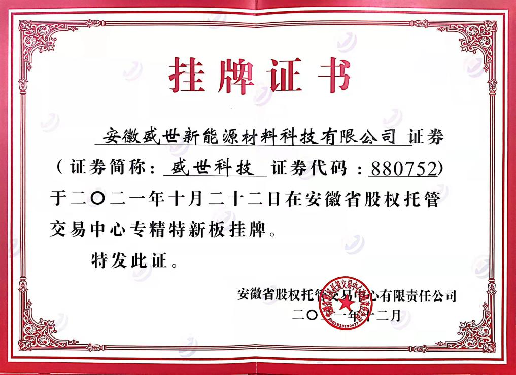 12月14日上午,安徽省第五批“專精特新板”企業(yè)掛牌儀式在合肥隆重舉行,來自全省的100家“專精特新”企業(yè)成功登陸省股權(quán)托管交易中心“專精特新板”。安徽盛世新能源材料科技有限公司在省“專精特新板”成功掛牌(證券代碼:880752)!