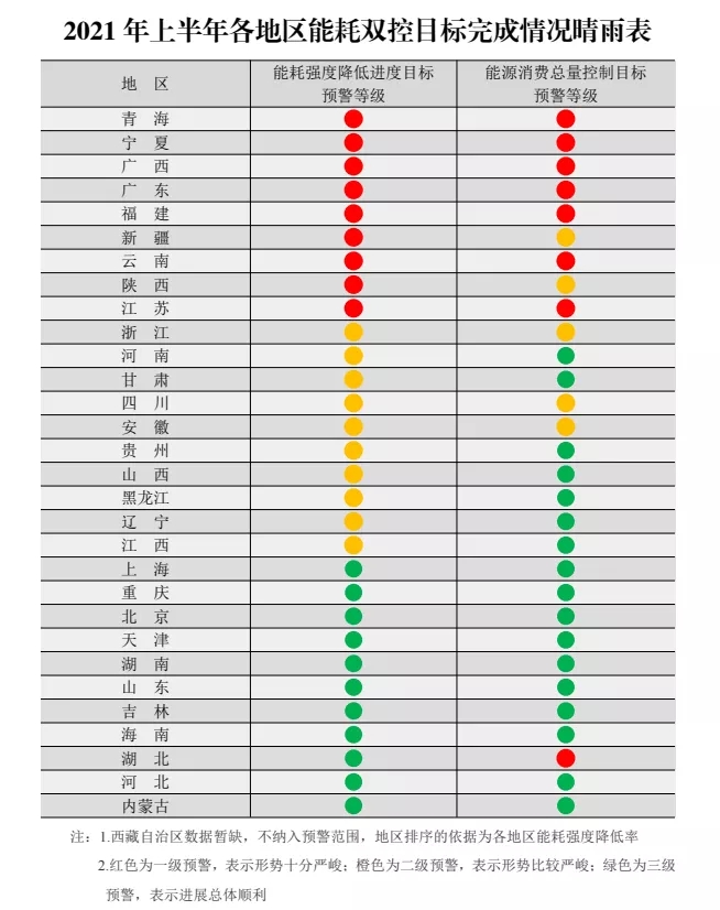 所謂“能耗雙控”政策,是指能源消費(fèi)強(qiáng)度和總量雙控的相關(guān)政策。今年以來(lái),對(duì)“能耗雙控”的考核一直比較嚴(yán)格。國(guó)家發(fā)展和改革委員會(huì)印發(fā)的《2021年上半年各地區(qū)能耗雙控目標(biāo)完成情況晴雨表》顯示,在能耗強(qiáng)度降低方面,青海、寧夏、廣西、廣東、福建、新疆、云南、陜西、江蘇9個(gè)?。▍^(qū))上半年能耗強(qiáng)度不降反升,被列為紅色的一級(jí)預(yù)警;在能源消費(fèi)總量控制方面,青海、寧夏、廣西、廣東、福建、云南、江蘇、湖北8個(gè)?。▍^(qū))被列為紅色的一級(jí)預(yù)警。